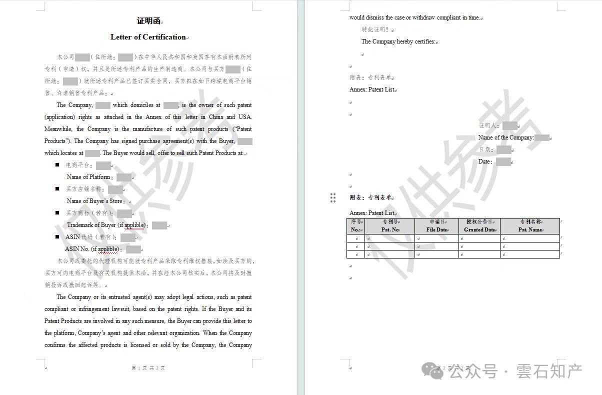 实践中,享有产品专利等知识产权的厂家会自行或委托代理机构主动提起侵权投诉或侵权诉讼,维护市场利益。因权利人的维权管理不足,特别是在委托第三方维权时,正品跨境卖家可能被波及,因此,建议跨境卖家除签订买卖合同外,要求厂家出具一份证明函,证明其所售产品为正品。笔者提供以下证明模板,供卖家朋友参考。如需word版,请私信小编。
